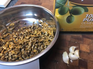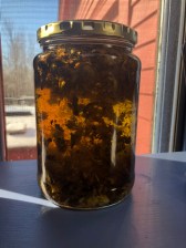 (Mullein flowers and chopped garlic infusing in Olive Oil)