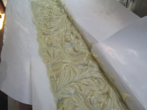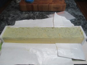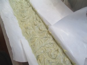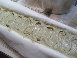 New recipe for this one. (Added castor oil for a better lather.) Added some French Green Clay for color and decoration, but it also draws out impurities and is rich in minerals. As always, the lemongrass and Cedarwood combo smell AWESOME! Cornmeal helps with exfoliation. A great soap for the hobby (or “Gentleman!”) farmer or gardener, or even a nice scrub-down in the shower. First time using the wavy cut.