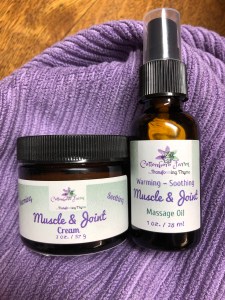The oil is a base of extra virgin olive oil solar infused (double marc) with arnica flowers, then loaded with essential oils specific to easing discomfort and swelling and provide gentle warmth. The cream adds Coconut Oil and Beeswax for those who prefer a thicker application.