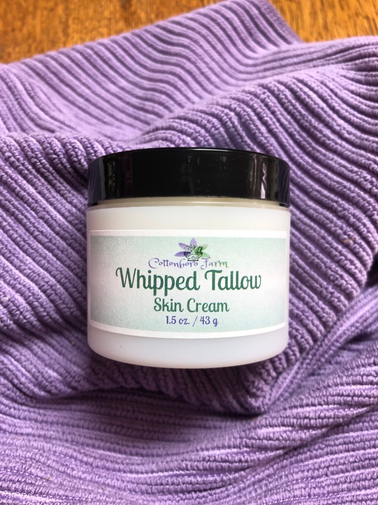 I am very happy to announce the beginning of a new line of skin products made from local beef (Top of the Hill Farm) tallow. I slow render the tallow right here at Cottonboro Farm myself. Tallow is what our ancestors used on the farm for centuries to pamper their hard-working, weather-worn skin. Tallow is closely aligned to the oils in our own skin. It is a wonderful healing moisturizer laden with vitamins and nutrients to replenish those we lose as we age. If you, like me, are one of the few people who are sensitive to coconut oil, or nothing seems to help your severely dry skin, then you’ll definitely want to give tallow a try!