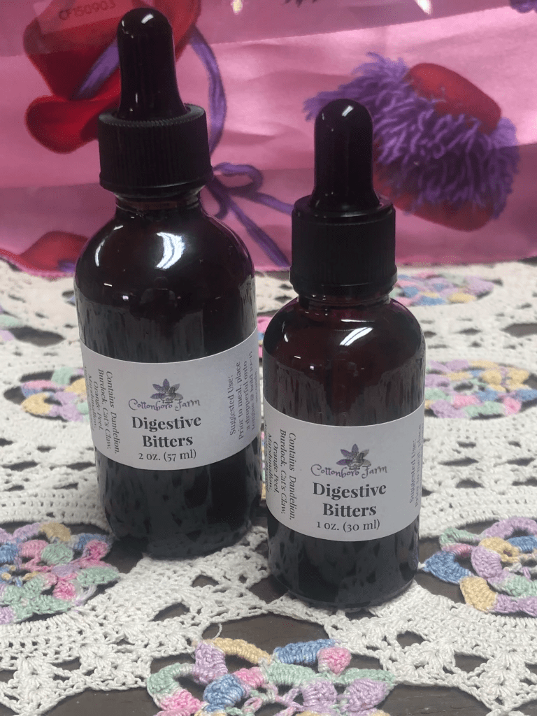 Digestive Bitters: A blend of herbs to support good digestion and strengthen the digestive tract. Dandelion, Burdock, Cat’s Claw, Orange Peel, Marshmallow, Angelica, Blessed Thistle, Yellow Dock, Ginger & Fennel. $10/$18